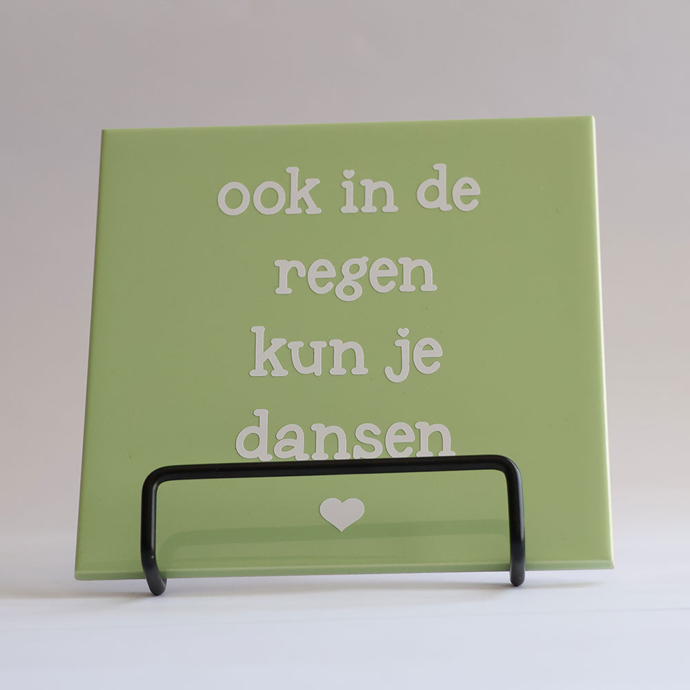 Een handgemaakt tegeltje van 15 x 15 cm, met zorg en aandacht gemaakt. Perfect als klein kunstwerkje in huis of als origineel cadeau. Elk exemplaar is uniek, met kleine verschillen die horen bij echt handwerk. Wordt geleverd zonder staander.
